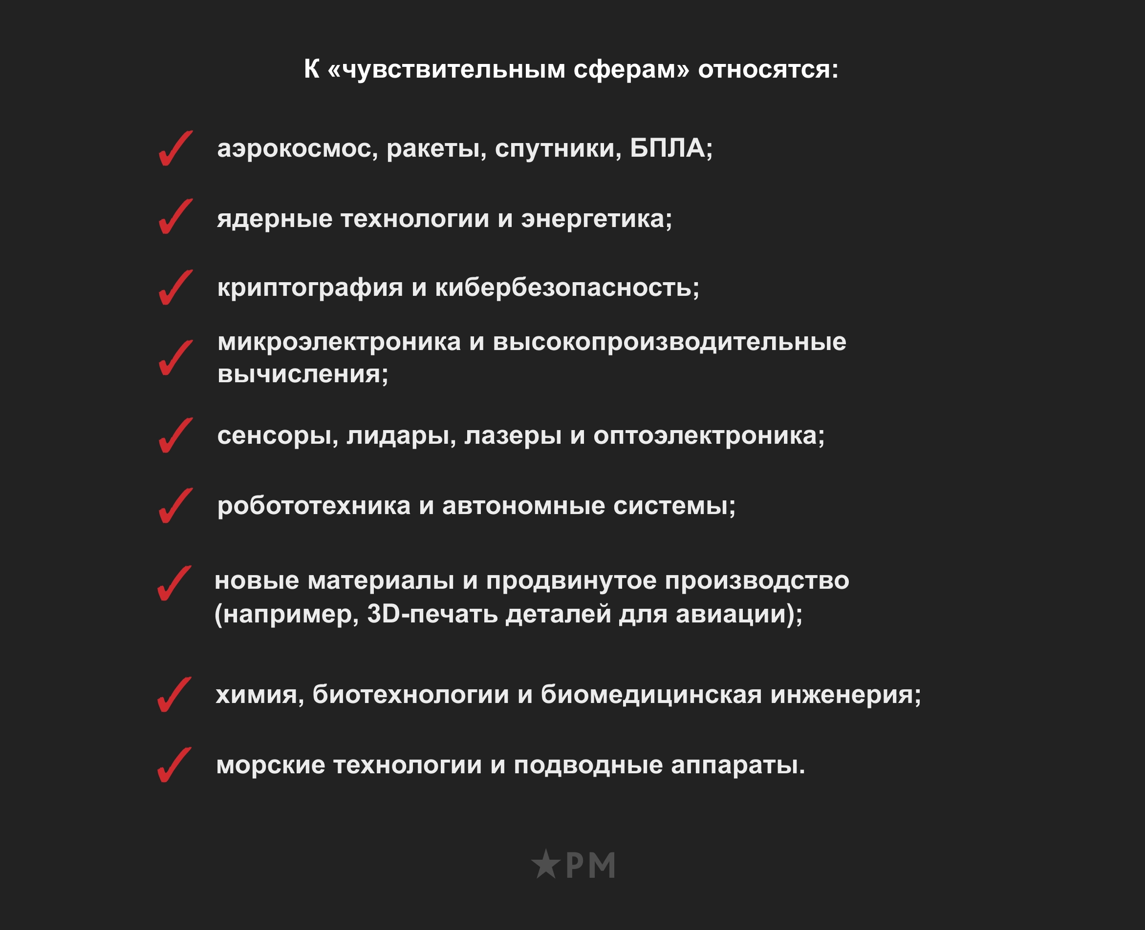 «Чувствительные сферы» — это направления науки и технологий, которые могут иметь двойное назначение: гражданское и военное. Консульские офицеры используют специальные списки (Technology Alert List, правила экспортного контроля EAR/ITAR), чтобы решить, не создает ли заявитель рисков для национальной безопасности.